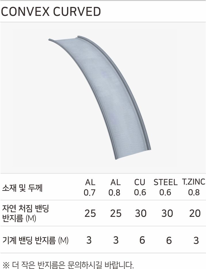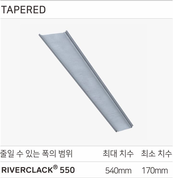 직선형 리버클락 판넬은, 반지름 값 25m까지 자연처짐으로 인한 곡면 구현이 가능합니다. 더 작은 반지름 값은 벤딩기를 사용하지 않고 구현할 수 있습니다. 마감재 금속의 소재에 따라다르며, 볼록한 패널에서 3m, 오목한 패널에서 8m의 반지름 값 까지 곡면을 구현할 수 있습니다. 테퍼드 패널의 경우, 패널의 끝부분 최소 폭은 170mm이며, 최대 폭은 540mm입니다. 테퍼드 패널은 직선형 패널과 마찬가지로, 자연 처짐으로 인한 곡면구현이 가능하며, 벤딩기를 사용한 곡면 구현이 가능합니다.